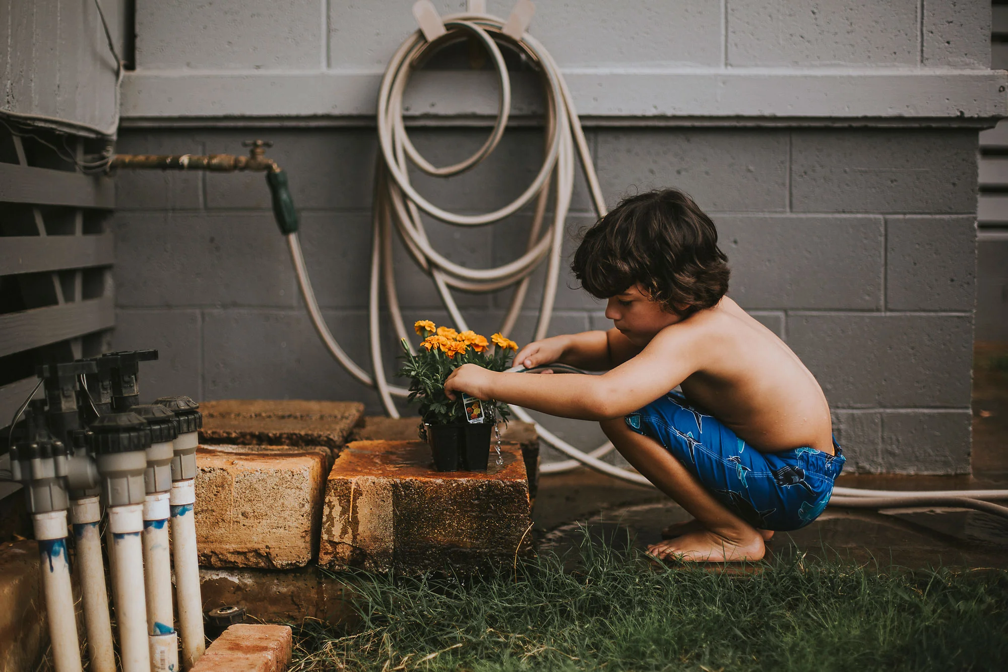 Day 81 - We bought some plants and he picked these flowers to be "his" plant. I dropped the hose on them right after this shot and broke most of the stems :(